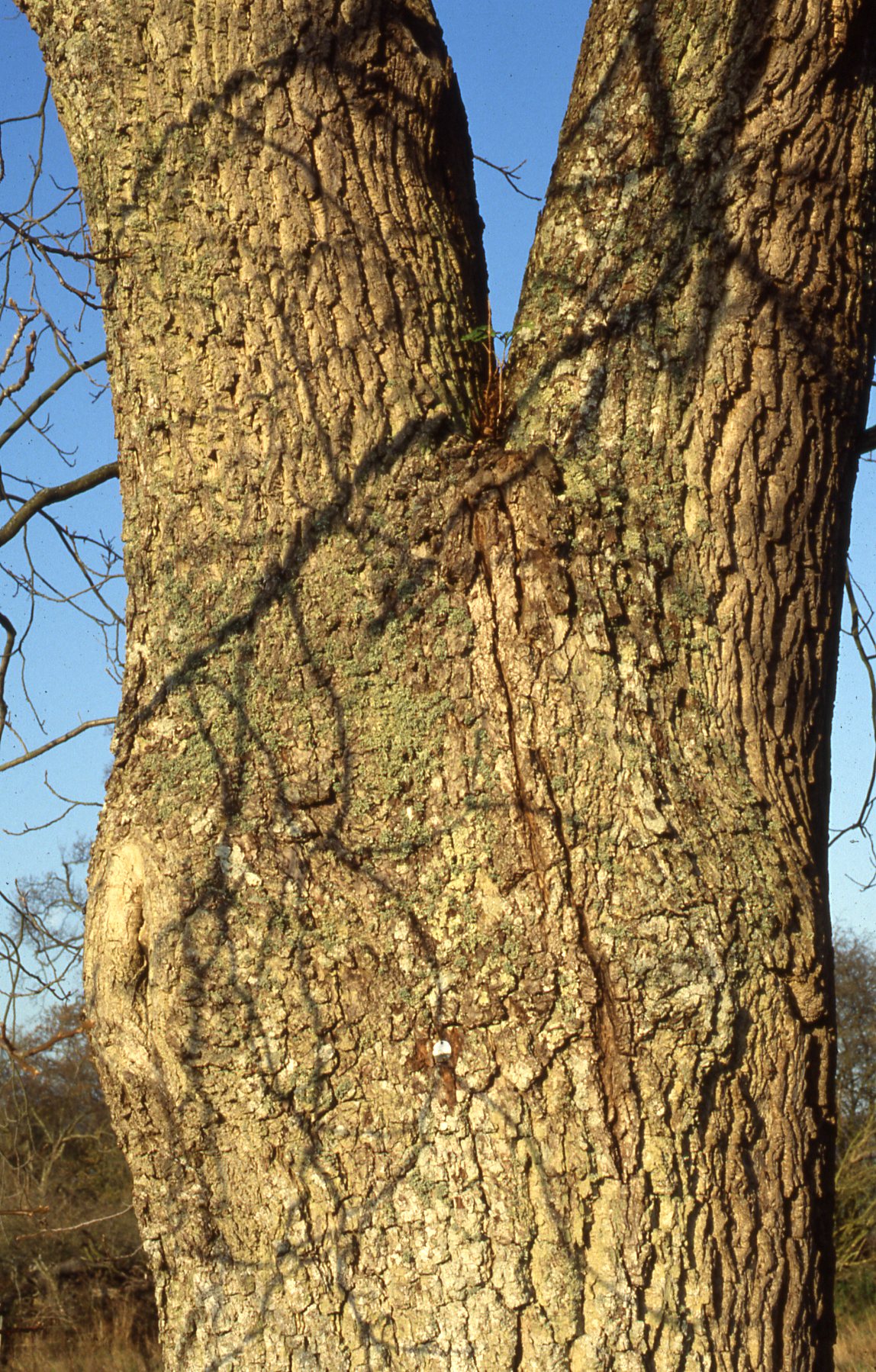 Major structural crack caused by narrow fork of twin trunks. Black Walnut. Note Elder growing out of crack indicating possible internal decay.